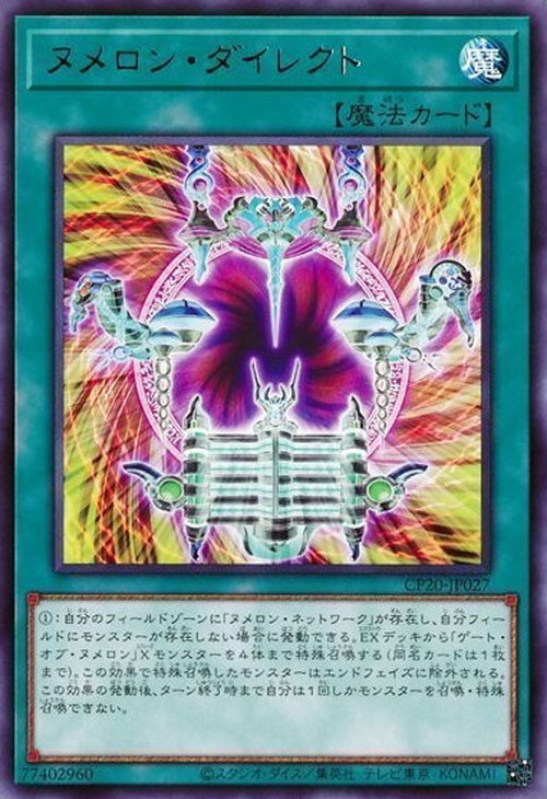 ①:自分のフィールドゾーンに「ヌメロン・ネットワーク」が存在し、自分フィールドにモンスターが存在しない場合に発動できる。EXデッキから「ゲート・オブ・ヌメロン」Xモンスターを4体まで特殊召喚する(同名カードは1枚まで)。この効果で特殊召喚したモンスターはエンドフェイズに除外される。この効果の発動後、ターン終了時まで自分は1回しかモンスターを召喚・特殊召喚できない。
