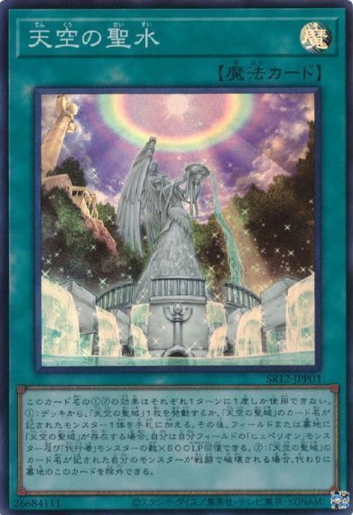 このカード名の①②の効果はそれぞれ1ターンに1度しか使用できない。 ①:デッキから、「天空の聖域」1枚を発動するか、「天空の聖域」のカード名が記されたモンスター1体を手札に加える。その後、フィールドまたは墓地に「天空の聖域」が存在する場合、自分は自分フィールドの「ヒュペリオン」モンスター及び「代行者」モンスターの数×500LP回復できる。 ②:「天空の聖域」のカード名が記された自分のモンスターが戦闘で破壊される場合、代わりに墓地のこのカードを除外できる。
