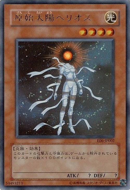 永続①:このカードの発動時の効果処理として、手札・デッキから「原始太陽ヘリオス」1体を特殊召喚できる。 ②:このカードが魔法&罠ゾーンに存在する限り、墓地へ送られるカードは墓地へは行かず除外される。