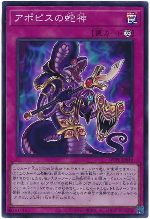 ①:このカードは発動後、通常モンスター(爬虫類族・地・星4・攻1600/守1800)となり、モンスターゾーンに特殊召喚する(罠カードとしても扱う)。その後、デッキから「アポピスの蛇神」以外の「アポピス」罠カード1枚を自分フィールドにセットできる。この効果でセットしたカードはセットしたターンでも発動できる。