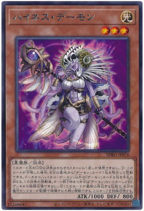 ①:手札・デッキからレベル7以下の「デーモン」モンスター1体を特殊召喚する。自分のEXデッキに表側の「デーモン」儀式モンスターが存在する場合、代わりに「ロワイヤル・デーモン」「デューク・デーモン」「ハイネス・デーモン」をそれぞれ1体まで手札・デッキから特殊召喚する事もできる。