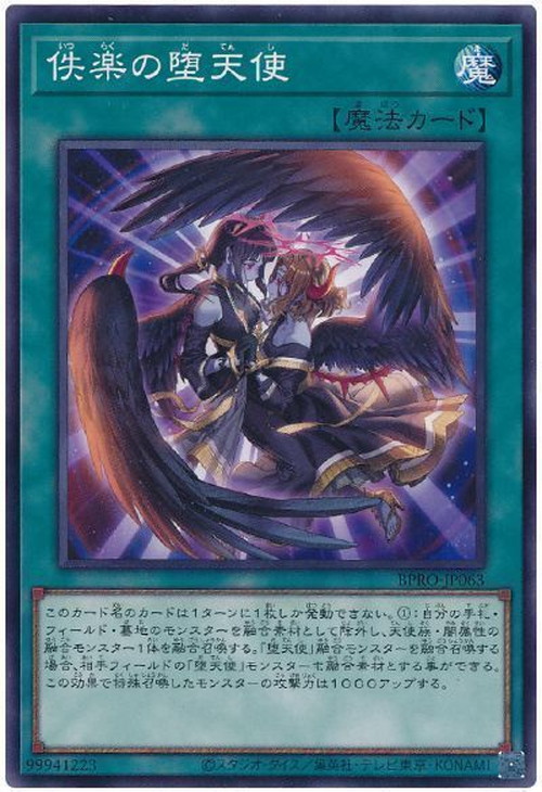 ①:自分の手札・フィールド・墓地のモンスターを融合素材として除外し、天使族・闇属性の融合モンスター1体を融合召喚する。「堕天使」融合モンスターを融合召喚する場合、相手フィールドの「堕天使」モンスターも融合素材とする事ができる。この効果で特殊召喚したモンスターの攻撃力は1000アップする。