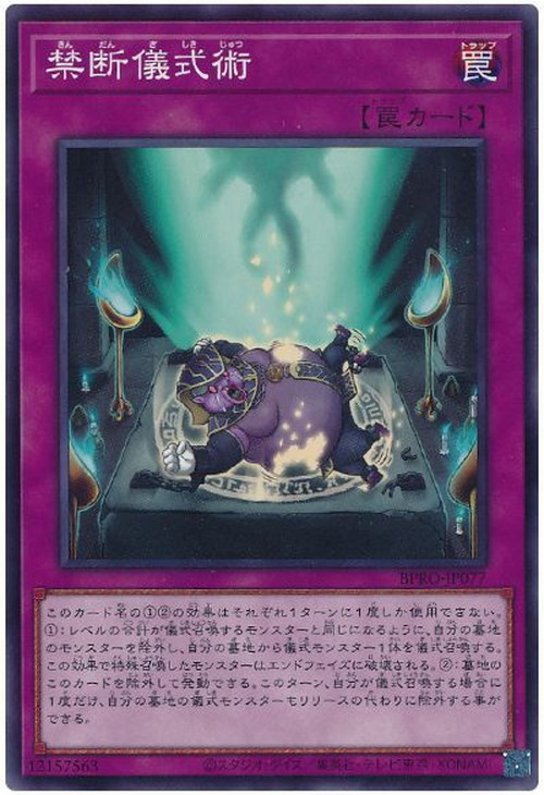 ①:レベルの合計が儀式召喚するモンスターと同じになるように、自分の墓地のモンスターを除外し、自分の墓地から儀式モンスター1体を儀式召喚する。この効果で特殊召喚したモンスターはエンドフェイズに破壊される。