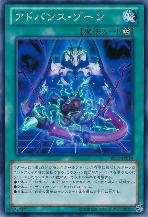 永続1ターンに1度、自分がモンスターのアドバンス召喚に成功したターンのエンドフェイズ時に発動できる。このターン自分がアドバンス召喚のためにリリースしたモンスターの数によって以下の効果を適用する。 ●1体以上:相手フィールド上にセットされたカード1枚を選んで破壊する。 ●2体以上:デッキからカードを1枚ドローする。 ●3体以上:自分の墓地のモンスター1体を選んで手札に加える。