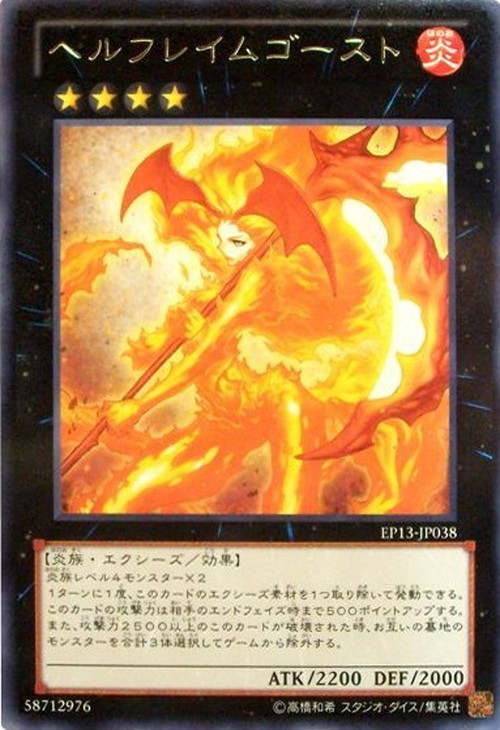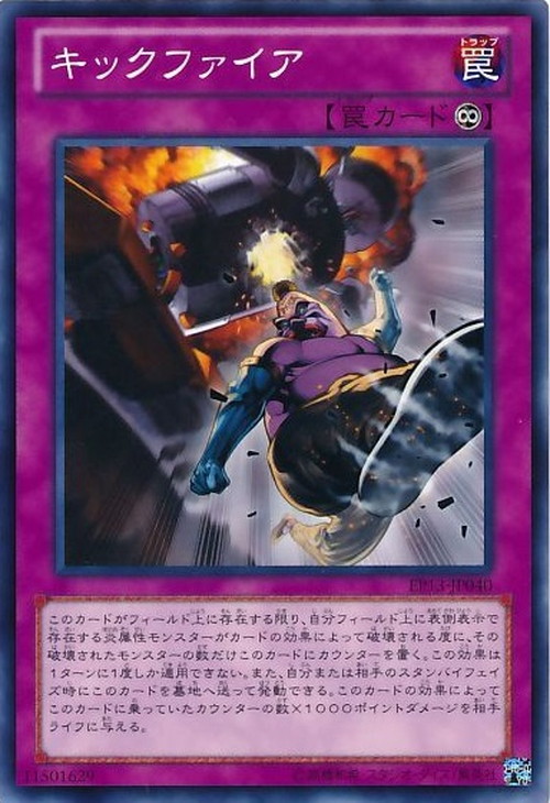 永続このカードがフィールド上に存在する限り、自分フィールド上に表側表示で存在する炎属性モンスターがカードの効果によって破壊される度に、その破壊されたモンスターの数だけこのカードにカウンターを置く。 この効果は1ターンに1度しか適用できない。また、自分または相手のスタンバイフェイズ時にこのカードを墓地へ送って発動できる。このカードの効果によってこのカードに乗っていたカウンターの数×1000ポイントダメージを相手ライフに与える。