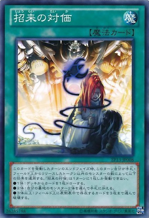 このカードを発動したターンのエンドフェイズ時、このターン自分が手札・フィールド上からリリースしたトークン以外のモンスターの数によって以下の効果を適用する。「招来の対価」は1ターンに1枚しか発動できない。 ●1体:デッキからカードを1枚ドローする。 ●2体:自分の墓地のモンスター2体を選んで手札に加える。 ●3体以上:フィールド上に表側表示で存在するカードを3枚まで選んで破壊する。