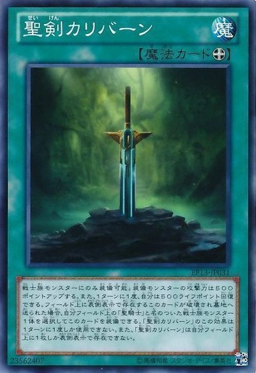 装備戦士族モンスターにのみ装備可能。装備モンスターの攻撃力は500ポイントアップする。 また、1ターンに1度、自分は500ライフポイント回復できる。 フィールド上に表側表示で存在するこのカードが破壊され墓地へ送られた場合、自分フィールド上の「聖騎士」と名のついた戦士族モンスター1体を選択してこのカードを装備できる。「聖剣カリバーン」のこの効果は1ターンに1度しか使用できない。 また、「聖剣カリバーン」は自分フィールド上に1枚しか表側表示で存在できない。