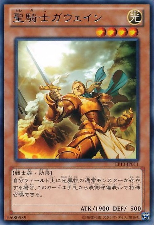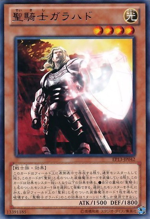 このカードはフィールド上に表側表示で存在する限り、通常モンスターとして扱う。 このカードが「聖剣」と名のついた装備魔法カードを装備している限り、このカードは効果モンスター扱いとなり以下の効果を得る。 ●自分の墓地の「聖騎士」と名のついたモンスター1体を選択して発動できる。選択したモンスターを手札に加え、自分フィールド上の「聖剣」と名のついた装備魔法カード1枚を選んで破壊する。「聖騎士ガラハド」のこの効果は1ターンに1度しか使用できない。