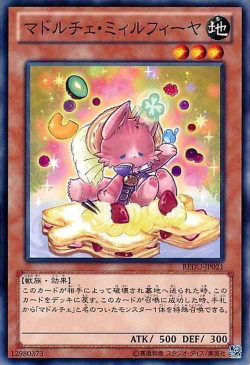 フィールドこのカードの発動時に、自分の墓地に「マドルチェ」と名のついたモンスターが存在する場合、そのモンスターを全てデッキに戻す。 このカードがフィールド上に存在する限り、フィールド上の「マドルチェ」と名のついたモンスターの攻撃力・守備力は500ポイントアップする。 また、「マドルチェ」と名のついたモンスターの効果によって、自分の墓地のモンスターがデッキに戻る場合、デッキに戻さず手札に戻す事ができる。
