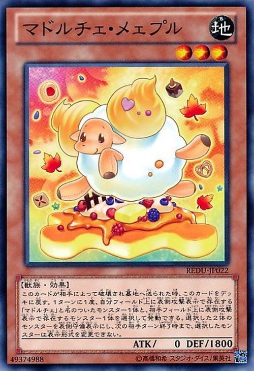 自分の墓地の「マドルチェ」と名のついたモンスター1体を選択してデッキに戻し、自分フィールド上に存在する全ての「マドルチェ」と名のついたモンスターの攻撃力・守備力は800ポイントアップする。その後、自分の墓地のモンスター1体を選んでデッキに戻す事ができる。