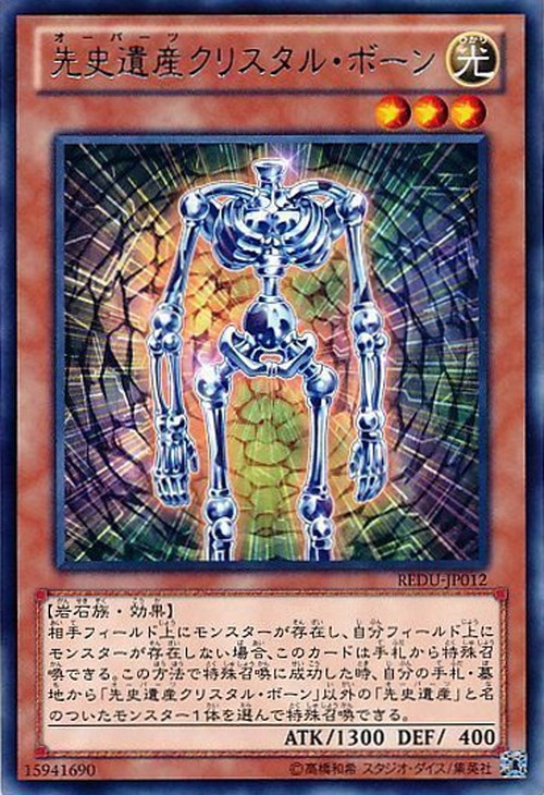 相手フィールド上にモンスターが存在し、自分フィールド上にモンスターが存在しない場合、このカードは手札から特殊召喚できる。 この方法で特殊召喚に成功した時、自分の手札・墓地から「先史遺産クリスタル・ボーン」以外の「先史遺産」と名のついたモンスター1体を選んで特殊召喚できる。