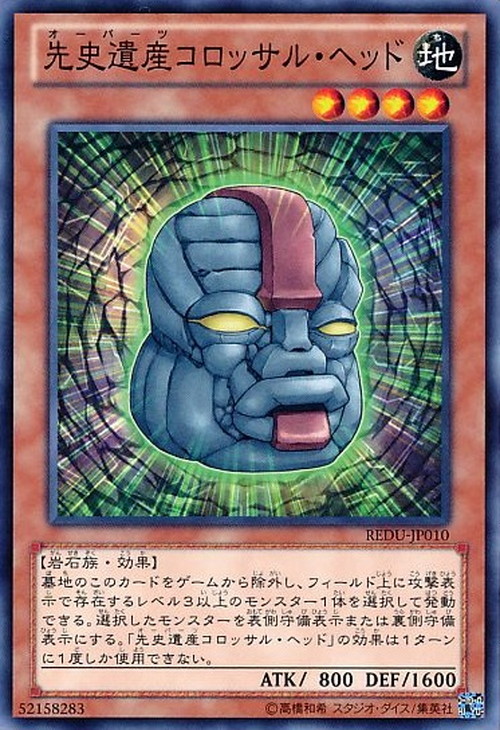 墓地のこのカードをゲームから除外し、フィールド上に攻撃表示で存在するレベル3以上のモンスター1体を選択して発動できる。選択したモンスターを表側守備表示または裏側守備表示にする。「先史遺産コロッサル・ヘッド」の効果は1ターンに1度しか使用できない。