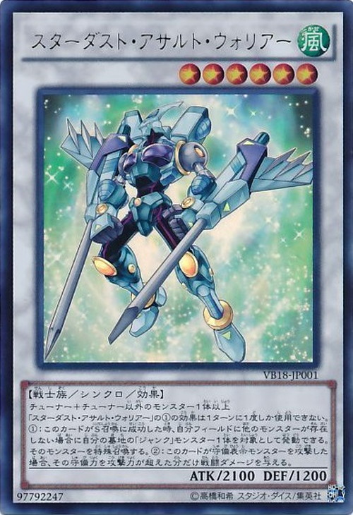「スターダスト・アサルト・ウォリアー」の①の効果は1ターンに1度しか使用できない。 ①:このカードがS召喚に成功した時、自分フィールドに他のモンスターが存在しない場合に自分の墓地の「ジャンク」モンスター1体を対象として発動できる。そのモンスターを特殊召喚する。 ②:このカードが守備表示モンスターを攻撃した場合、その守備力を攻撃力が超えた分だけ戦闘ダメージを与える。