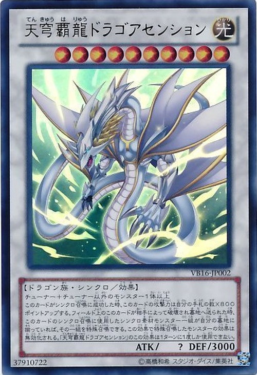 このカードがシンクロ召喚に成功した時、このカードの攻撃力は自分の手札の数×800ポイントアップする。 フィールド上のこのカードが相手によって破壊され墓地へ送られた時、このカードのシンクロ召喚に使用したシンクロ素材モンスター一組が自分の墓地に揃っていれば、その一組を特殊召喚できる。 この効果で特殊召喚したモンスターの効果は無効化される。「天穹覇龍ドラゴアセンション」のこの効果は1ターンに1度しか使用できない。