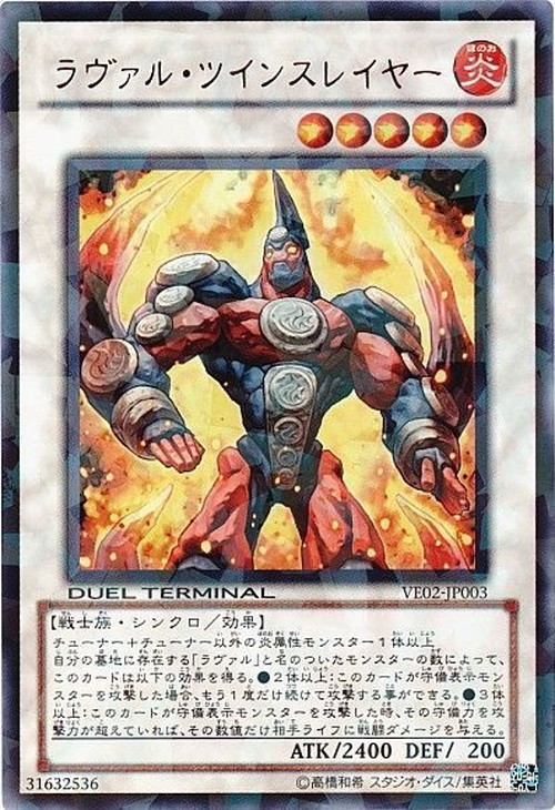 自分の墓地に存在する「ラヴァル」と名のついたモンスターの数によって、このカードは以下の効果を得る。 ●2体以上:このカードが守備表示モンスターを攻撃した場合、もう1度だけ続けて攻撃する事ができる。 ●3体以上:このカードが守備表示モンスターを攻撃した時、その守備力を攻撃力が超えていれば、その数値だけ相手ライフに戦闘ダメージを与える。