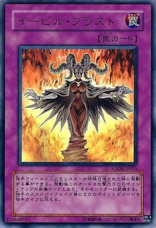 相手フィールド上にモンスターが特殊召喚された時に発動する事ができる。発動後このカードは攻撃力500ポイントアップの装備カードとなり、そのモンスターに装備する。相手のスタンバイフェイズ毎に500ポイントダメージを相手ライフに与える。