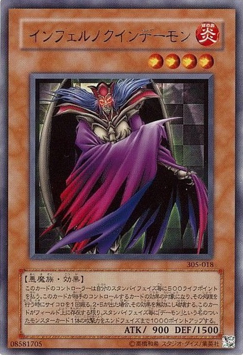 このカードのコントローラーは自分のスタンバイフェイズ毎に500ライフポイントを払う。 このカードが相手のコントロールするカードの効果の対象になり、その処理を行う時にサイコロを1回振る。2・5が出た場合、その効果を無効にし破壊する。 このカードがフィールド上に存在する限り、スタンバイフェイズ毎に「デーモン」という名のついたモンスターカード1体の攻撃力をエンドフェイズまで1000ポイントアップする。