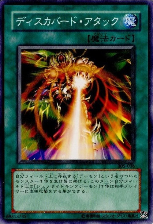 自分フィールド上に存在する「デーモン」という名のついたモンスター1体を生け贄に捧げる。このターン自分フィールド上の「ジェノサイドキングデーモン」1体は相手プレイヤーに直接攻撃をする事ができる。