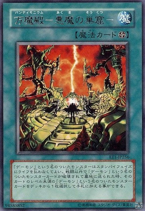 フィールド「デーモン」という名のついたモンスターはスタンバイフェイズにライフを払わなくてよい。 戦闘以外で「デーモン」という名のついたモンスターカードが破壊されて墓地に送られた時、そのカードのレベル未満の「デーモン」という名のついたモンスターカードをデッキから1枚選択して手札に加える事ができる。