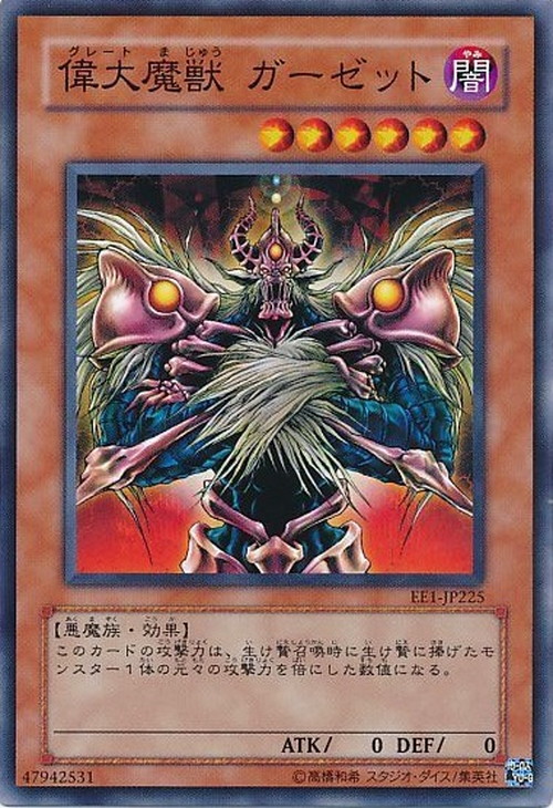 「闇の支配者との契約」により降臨。 ①:1ターンに1度、自分メインフェイズに発動できる。サイコロを1回振り、出た目の効果を適用する。 ●1・2:相手フィールドのモンスターを全て破壊する。 ●3・4・5:相手フィールドのモンスター1体を選んで破壊する。 ●6:自分フィールドのモンスターを全て破壊する。