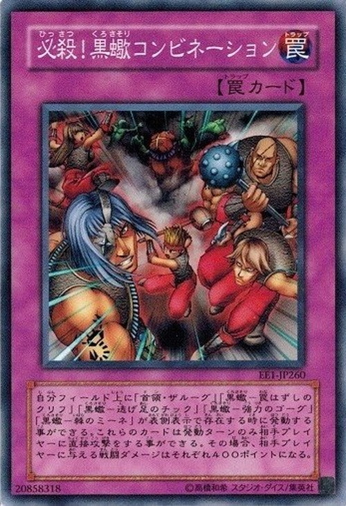 自分フィールド上に「首領・ザルーグ」「黒蠍-罠はずしのクリフ」「黒蠍-逃げ足のチック」「黒蠍-強力のゴーグ」「黒蠍-棘のミーネ」が表側表示で存在する時に発動する事ができる。これらのカードは発動ターンのみ相手プレイヤーに直接攻撃をする事ができる。その場合、相手プレイヤーに与える戦闘ダメージはそれぞれ400ポイントになる。