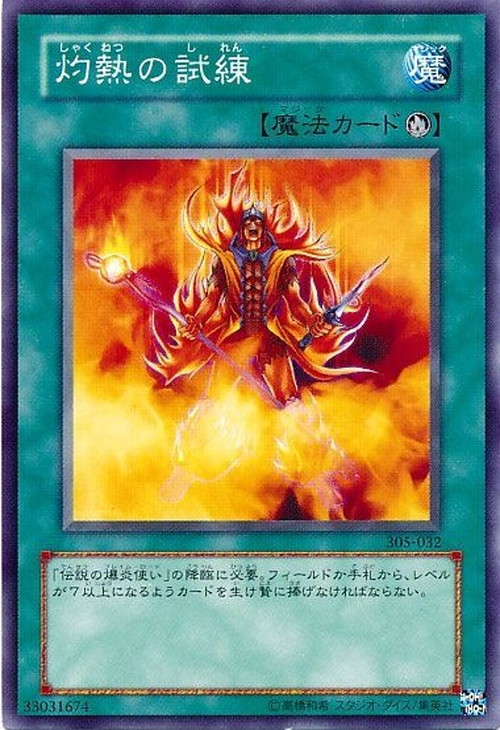 儀式「伝説の爆炎使い」の降臨に必要。フィールドか手札から、レベルが7以上になるようカードを生け贄に捧げなければならない。